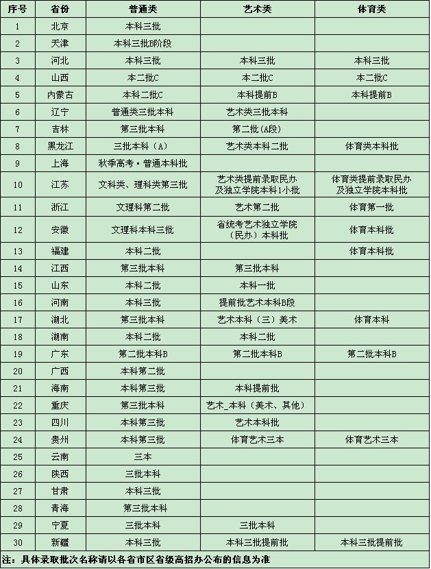 2014年我校在各省市招生录取批次一览表