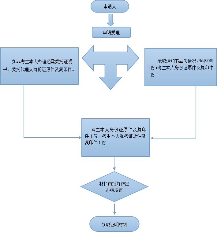 | 办事流程 | 申请受理→材料审核→办结总结(附:录取通知书丢失办理流程图) |